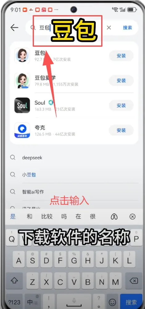三、在搜索框里输入"豆包"两个字,怕输错字的朋友,可以复制文章中【豆包】