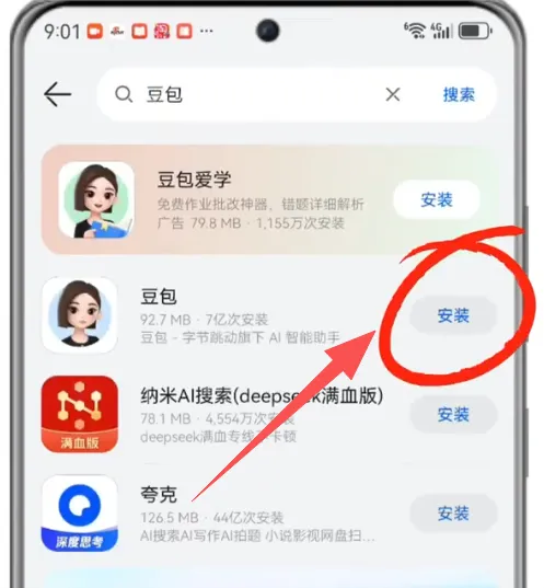 四、搜索出来后,找到豆包APP,点击"安装"按钮。等个一两分钟,安装完成,就能打开使用了!