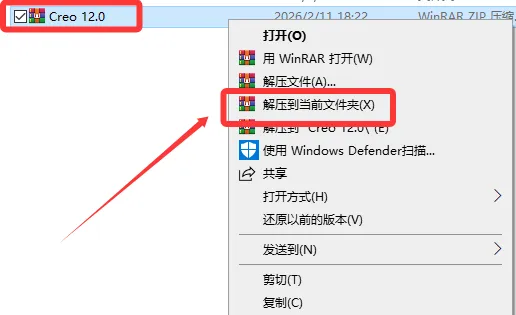 1. 选中下载好的压缩文件,点击鼠标右键选择解压到Creo12.4。