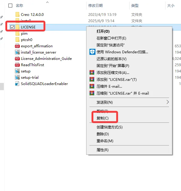 2. 打开解压好的文件夹,选中LICENSE文件夹,点击鼠标右键选择复制