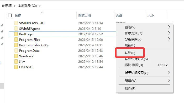 3. 打开电脑C盘,在空白处点击鼠标右键选择 粘贴。