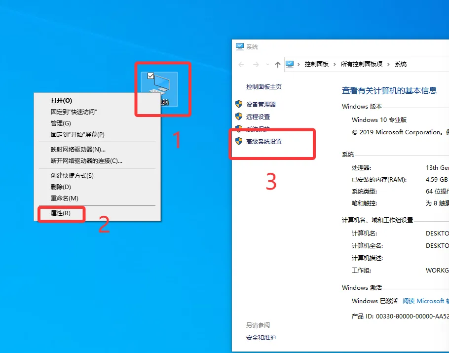 8. 桌面选中 此电脑 点击鼠标右键选择 属性,点击高级系统设置。