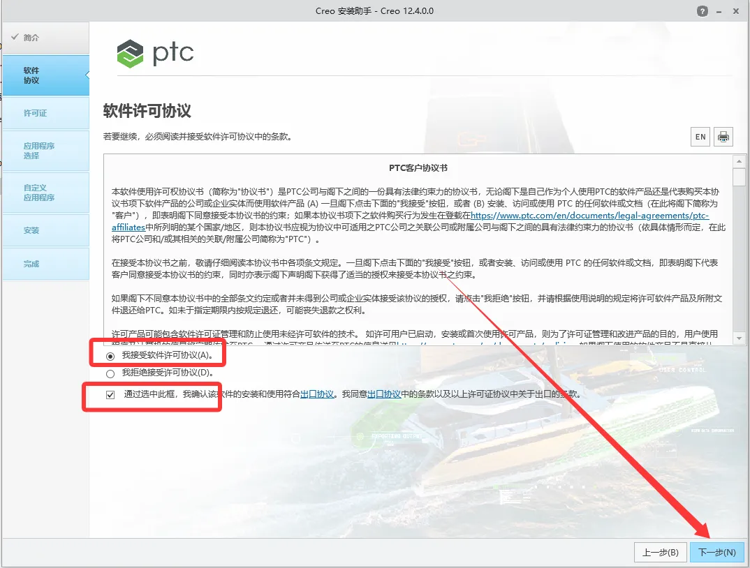 13. 先选择我接受软件许可协议,后勾选通过选中……,点击下一步。