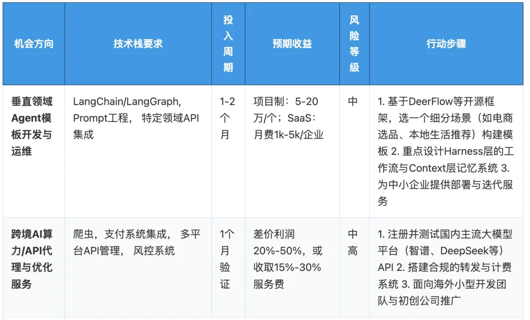 企业级Agent定制与多模态内容生成工具集成,机会窗口期为6-12个月,随后将出现标准化产品,门槛降低,竞争加剧。