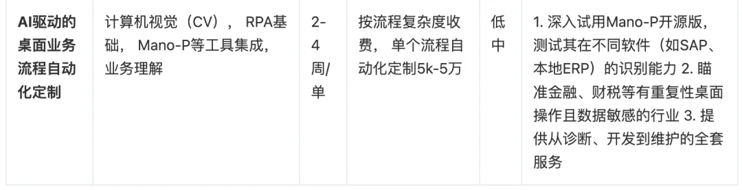 风险提示:跨境API服务面临政策与合规风险,需准备备用支付通道和法务支持。Agent模板开发需警惕目标场景被大厂标准化产品覆盖。桌面自动化定制项目高度依赖Mano-P等工具的识别准确率,需在合同中明确交付标准与验收条件。