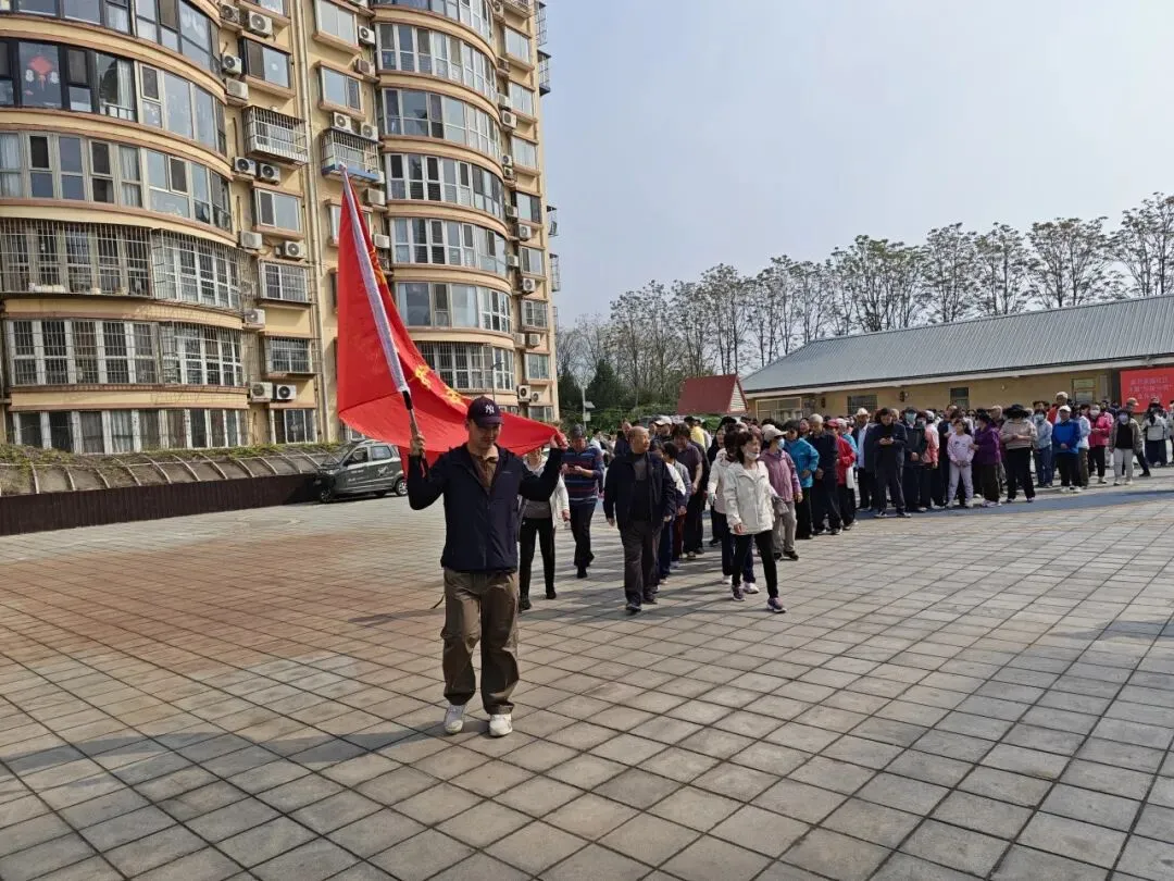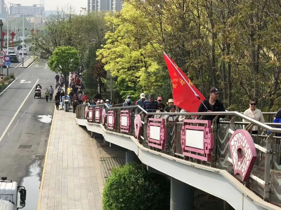 居民们排着有序的队列统一从社区广场出发,大家迎着和煦的春风向打卡点一路行进。