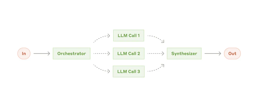 图2 Anthropic 的 orchestrator-workers 工作流:由一个总控负责拆任务,再交给多个 worker 分别完成。