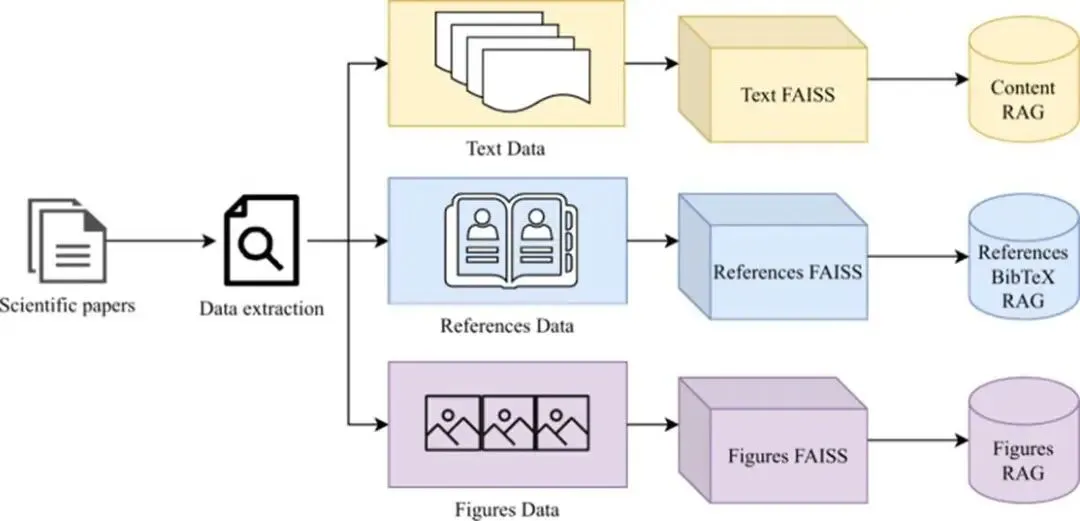 这张图更值得科研写作者借鉴。它说明一个很朴素但经常被忽略的事实:论文不是只有正文。真正让文章变得像一篇论文的,还有引用、图表和结构。把这三类东西拆开存储、拆开检索,AI 写出来的文本才更像“有证据支撑的科研写作”,而不是“像论文的连续自然语言”。