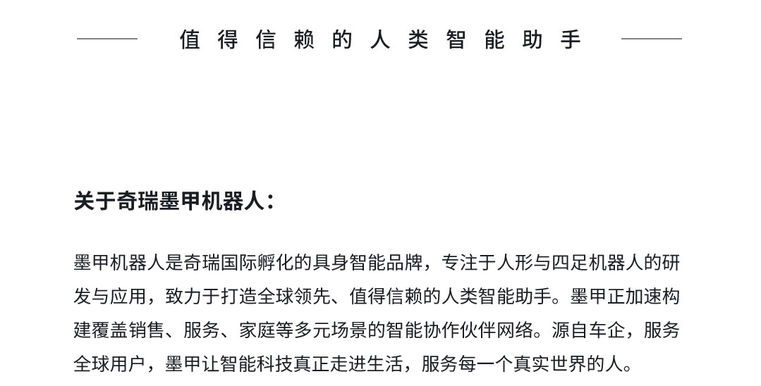 这正是墨甲机器人的独特底气:依托奇瑞强大的产业链与技术栈,我们将领先一代的汽车智能化技术,完整地迁移到了机器人身上。这种“技术溢出”不是在寻找捷径,而是利用成熟的高阶技术对初生行业进行“降维赋能”。