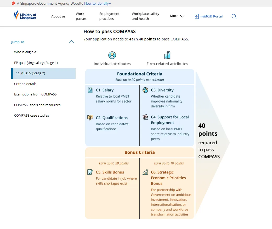 自2023年9月起,EP申请全面实行互补专才评估框架(COMPASS),所有申请人须在四个基础项中累计达到至少40分才能获批。2026年,COMPASS正式进入2.0阶段,对企业员工多元化及本地人占比审计更加严格。