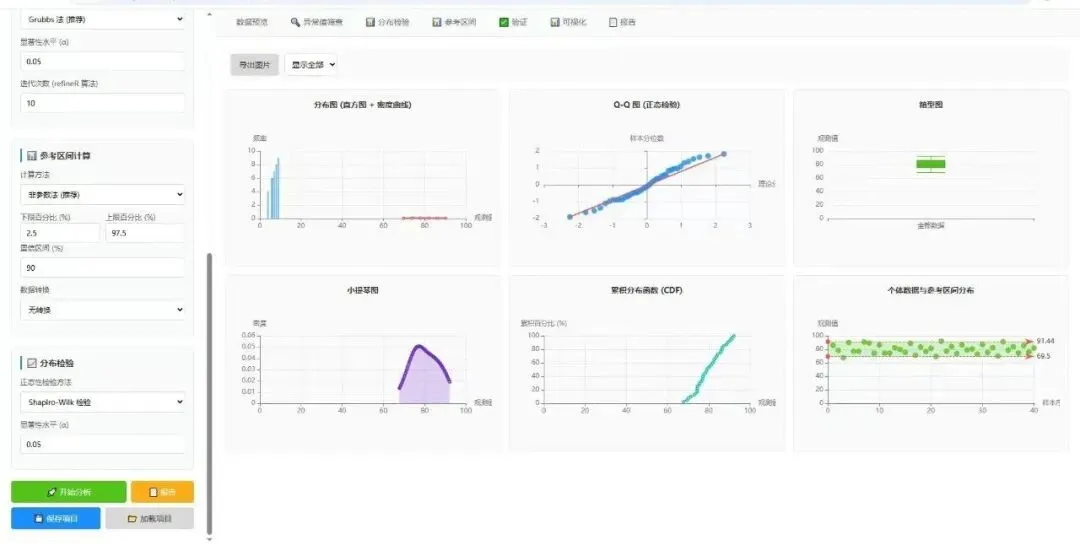- 累积分布函数 (CDF) 及散点图:一目了然看清个体数据与参考区间的关系。