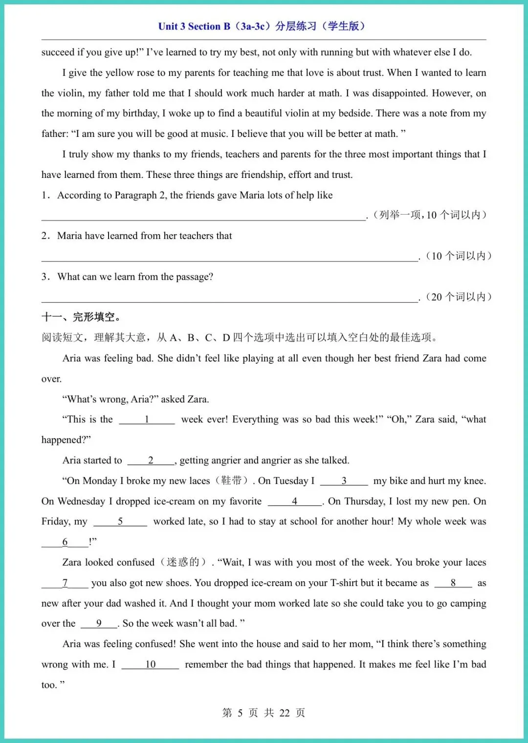 2025春人教版八年级下册英语Unit3 Section B(3a-3c)分层练习,22页精编电子版,一键可打印!这份资料把“基础巩固—能力提升—拓展拔高”三级梯度一次打包:词汇变形、句型转换、阅读策略、写作模板全配典型例题,左栏讲技巧,右栏即练即评,孩子10分钟就能摸清短板,20分钟就能看见提分。期末想冲刺110,先把这22页啃透!需要的家长现在就去打印,今晚就让孩子练起来!