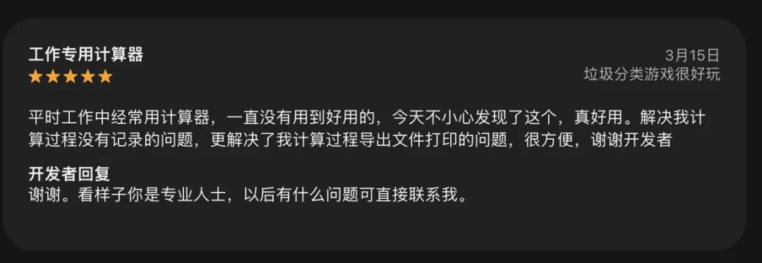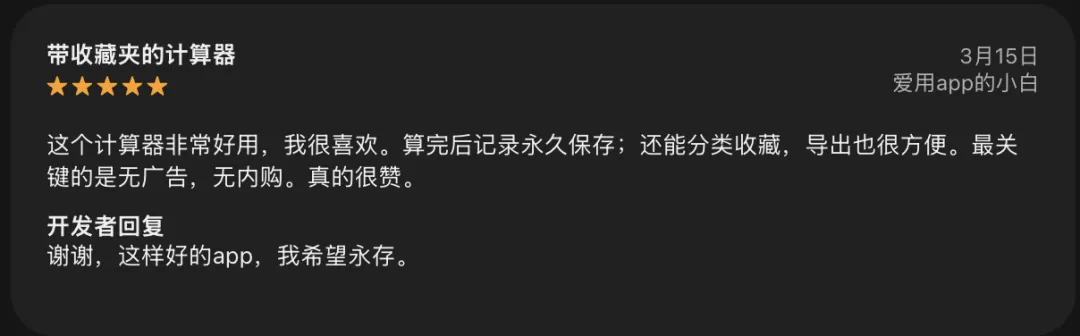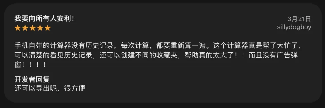 有的写“这个计算器非常好用,我很喜欢。算完后记录永久保存;还能分类收藏,导出也很方便。最关键的是无广告,无内购。真的很赞。”,还有的写“平时工作中经常用计算器,一直没有用到好用的,今天不小心发现了这个,真好用。解决我计算过程没有记录的问题,更解决了我计算过程导出文件打印的问题,很方便,谢谢开发者”。