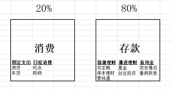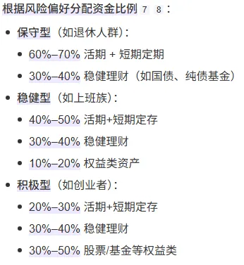 懒人存钱模板中 消费和存款 怎么配置和规划首先呢,就是说准备三个账户。然后公司收款账户呢,就用作收工资,不做日常的消费。然后第二个呢,是自动存款账户。就是存钱用的啊,不绑任何的支付软件。然后第三个呢,就是日常消费账户,就是绑定支付软件,用来吃饭通勤。购物,然后花销,买东西用的。然后呢,这个是之前的那个懒人存钱模板的这么一个大概的一个思路。啊然后接下来呢,针对这个每一个账户的用途,我想具体说一下怎么使用和一些使用的比例问题。下面我们说一些,就是具体的比例的问题。就是说,就是工资发下来之后,你的钱分成两部分,一部分呢是生活需要,一部分是存钱。现在就是一般情况下有两种类型的方式,适合两种类型的人。就是第一种呢,就是消费型的,就我可以存20%的钱,就把20%的钱当做存款,然后剩下的百分之80呢作为消费。这是一种类型。还有一种类型的人呢,就是说就是存款型的人,就是说我的那个收入,能维持我最低的这个生活。就是其他的钱全都存起来。那么这个就适合,就是说我把20%的钱作为消费,80%的钱就存起来。就比如我收入1万块钱。我可能3000块钱就够我日常开销了,那我就用3000块钱去消费,然后剩下的7000块钱,我就可以去全部存起来。这是一种类型的,这种情况。我想很多朋友都有这种情况啊。当然这两种呢,根据你自己的情况而定。嗯,然后下面我们具体说一下。就是说,如果说你是说大部分的钱就用在消费,少部分钱是用做存款的话。那你这个存款存到一定程度的时候,你就可以把这个存款进行一定理财。那理财呢,就是用最简单的方式,就是分成两部分。一部分是稳健,一部分是激进。稳健的话,你可以去买一些银行的保本的理财和保本基金,或者说存到微信零钱通,或者存到那个支付宝的余额宝,那个就是有固定收益,这是保守的。激进的呢,可以买一些债券,是不是?可以做一些你认为比较合适的投资都可以。然后这是一方面,还有就是存款型的人呢。存款型的人,就是说80%的都是存款,剩下的是消费,最低消费。那这种类型的方式就是存款比较多,时间久了存的就比较快。就是滚成大钱之后,他也可以按这两种方式,一部分激进,一部分保守。那保守的话也是按照刚才的逻辑,做零钱通啊,或者是保本理财,或者银行的一些定期存款。定期存款还是比较推荐的。就是小额定期、大额定期,然后这样的话利润会比较多,利息相对较高,然后剩一部分再去做激进的投资。当然了,如果你很稳健的话,你也可以把存款全部做稳健的投资。其实呢对于存款这方面的一些去做什么理财,还是说怎么存钱,怎么存定期。其实网上有很多的方法,就是有一次我看到一个,就是按照风险偏好来分配这个资金比例。比如说保守型的,比如说退休人群啊或者什么的,他就可以70%活期加短期定期,30%多是稳健理财,如国债什么的。如果是稳健型的呢,就比如说上班族啊,或者说等等等等。就是40%多50,就是活期加短期定存。30%、40%稳健理财,10%做权益类投资。至于什么是权益类投资,大家可以查一查。就是比较激进。然后还有就是积极型的,就比如说创业者啊,或者说有一定资金的人,他就可以把20%。作为活期和短期定存,还30%40%做稳定理财,30%50%做一些股票基金之类的啊。这是一些激进激进警型的。当然网上我看到这些之后呢,很详细,然后也感觉也很专业。但是我个人觉得啊。对于咱们普通人来说,觉得太复杂。我还是认为就是你的存款分两部分就可以。如果你喜欢激进,那你就激进的资金多一点。就比如,你还是说把你的钱分成两部分。一部分是保守,一部分是激进。这样的话,你是激进的人,你想激进,你就激进的钱用的多一点,去做一些激进的一些理财。如果你是稳重型的型,你就把你的稳健型的这部分多用的多一点,然后去做一些稳健的投资啊。举个例子,就比如说我的存款现在存了,比如说已经存了30万啊,如果我按照稳健和激进的话。我可以一半15万做稳健的,是存定期,短期定期,或者是保本理财。然后另外15万啊,我可以做一些激进类的,比如说那个基金,买卖基金试试。买买收益高的理财之类的,这样。当然了,这个比例啊,一半一半,大家就可以调整,根据自身的情况。如果你是完全一个存钱型,很激进的话,你大可以把你的存存款全部存到稳定的理财里边,就是稳健型的。就是我全都存定期。我全都存这个稳健理财,或者我全都放那个微信零钱通,都可以。哪个利息高我就放哪个。然后我就不做基金了,这样也可以,非常好。当然有激进者的,我把我所有的钱都去投资这个基金的,这个基金里边,或者更就是投资一些股票之类的。激进的人也可以根据你的风险偏好来做。你要了解你自身的情况来决定你是做稳健,还是做激进,还是一半一半。啊,根据自身的情况。根据你的生活,这样的话会更保险一点啊。如果你生活上有老下有小,或者你的生活不是那么的轻松,那还是稳健多一点更好。如果你就是钱很有富裕,你就可以激进一点,是不是?或者说基金的比例大一点。反正这是个人的观点啊,仅供参考。总的来说就是这些。