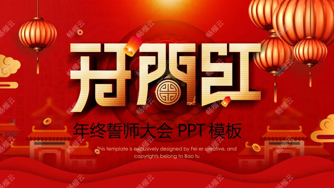 专为年终誓师大会打造的开门红主题PPT,以中国红为主背景色搭配金色元素,融入灯笼、祥云、铜钱等传统年俗元素,传递“回顾过往战绩、开启全新征程”的内核。支持全内容自由修改,可快速打造大气磅礴的年终誓师大会演示,助力企业凝聚团队士气,为新一年业绩冲刺筑牢根基。