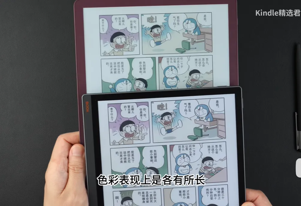 一聊到彩屏,大家最关心的是色彩表现如何。我直接掏出了最新款的Kindle Scribe Colorsoft来跟它贴脸对比。结果可能让你们失望了:在细节上Kindle更好。