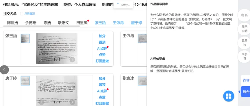 课堂上,毛鈺老师以AI 视频沉浸式导入,快速带领学生走进风雪草料场的经典情境;创新设计 “情绪心电图”、“人物矛盾分析”等探究任务,引导学生在小组合作中层层拆解人物命运与时代困境,深刻理解小说 “官逼民反” 的主题内核,让思辨能力在真实探究中落地生长。