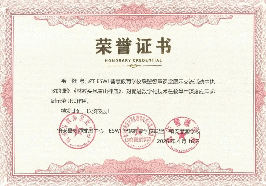 为深入落实教育部《“人工智能 + 教育” 行动计划》中推动人工智能与教育教学深度融合、构建智能化教育新生态的核心理念,4 月 16 日,在陕西镇安举办的教育部教育信息化教学应用实践共同体ESWI 智慧教育学校联盟同课异构活动中,镇安慧源学校毛鈺老师带来高中语文《林教头风雪山神庙》精品课,以 AI 技术重构语文课堂,成为活动亮点课例之一。