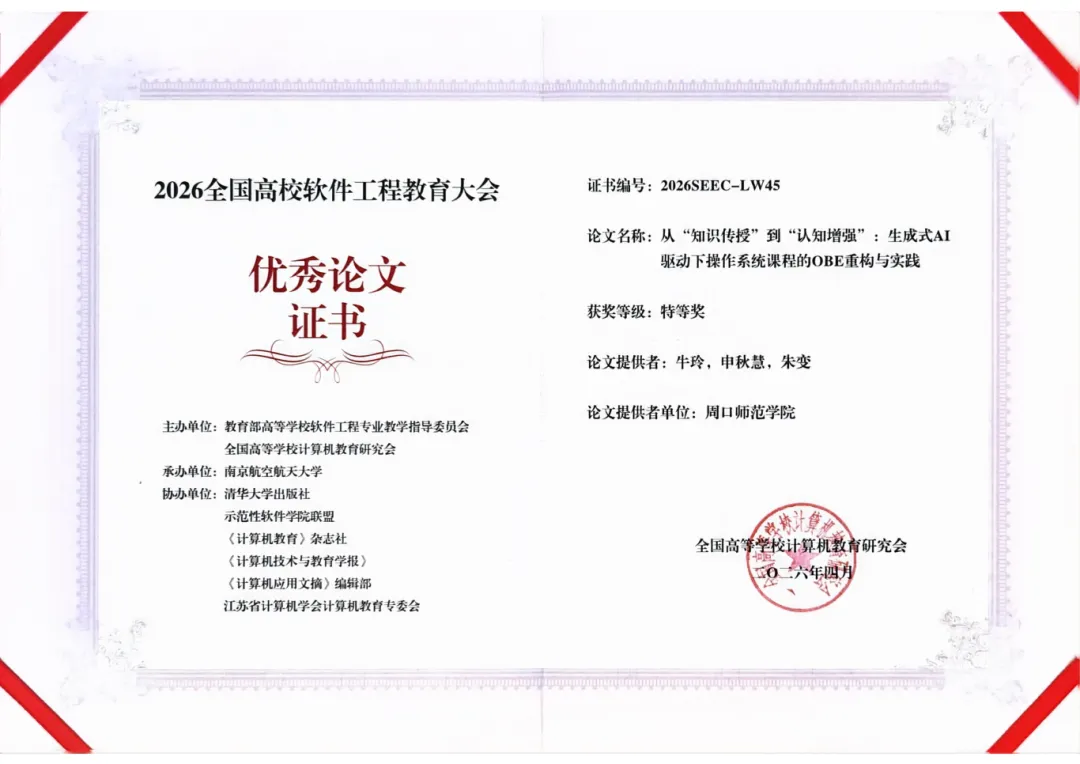 经大会组委会严格评审,牛玲老师课程团队的论文《从“知识传授”到“认知增强”:生成式AI驱动下操作系统课程的OBE重构与实践》获全国特等奖、《面向解决复杂工程问题的人际协同教学模式探索——以<操作系统>课程为例》获全国一等奖,教学案例《从工具到伙伴:面向软件系统设计“生产者-消费者”同步问题的人机协同教学创新》获全国一等奖。
