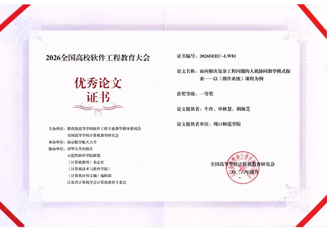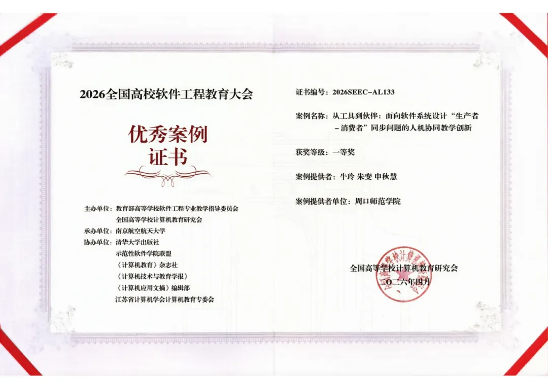 近日,以“智赋软工,育见新程”为主题的2026全国高校软件工程教育大会在江苏南京隆重召开。我校计算机科学与技术学院牛玲老师课程团队凭借两篇高质量教学研究论文与一项优秀教学案例,在全国高校激烈角逐中脱颖而出,一举荣获论文特等奖、论文一等奖、教学案例一等奖三项荣誉,并因论文特等奖受邀在大会作专题报告,充分展现我校在AI赋能软件工程教育与课程改革领域的扎实功底。