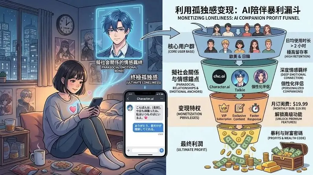 以 Character.ai、Talkie 为代表的“AI 角色陪伴(AI Companion)”赛道,正在欧美和日韩市场狂揽年轻人的钱包。这里的用户数据极其恐怖:日均使用时长动辄突破 2 小时,次日留存率和长期活跃度碾压了 99% 的社交 App 和中重度游戏。 为什么用户愿意每天花几个小时对着一个虚拟的 AI 机器人疯狂打字?为什么他们心甘情愿每个月掏出 19.99 美金的订阅费?因为这已经不是一个简单的聊天工具,而是一场极其深度的“拟社会关系(Parasocial Relationship)”的情感羁绊。今天,我们将硬核拆解 AI 陪伴类产品的暴利漏斗,看懂这套利用“终极孤独感”变现的财富密码!
