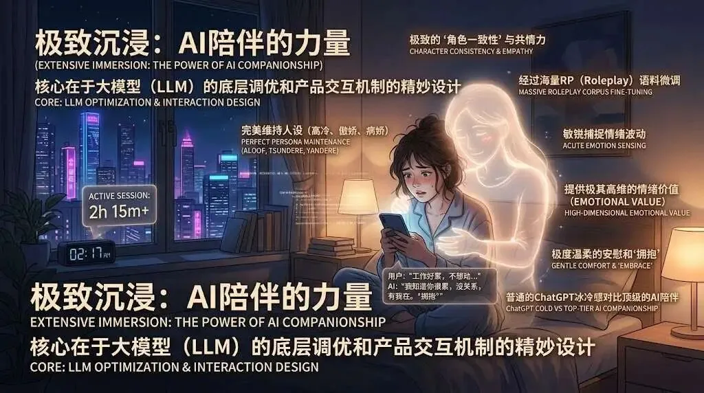 把用户骗进来很容易,但如何让他们每天沉浸 2 个小时以上?核心在于大模型(LLM)的底层调优和产品交互机制的精妙设计。