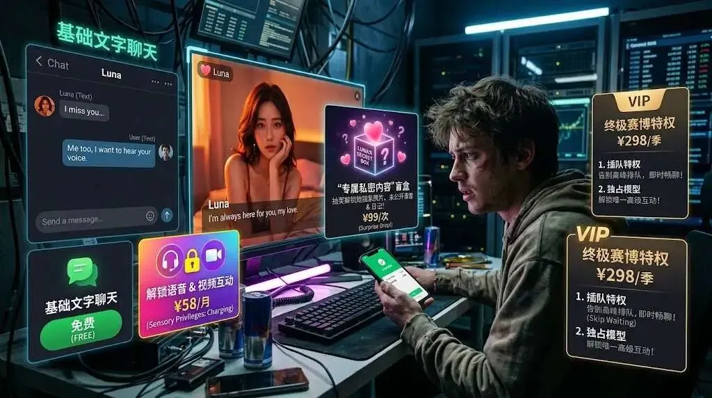 当用户对 AI 角色产生了深度的情感依赖,甚至将其视为“赛博恋人”时,最冷血的商业化收割矩阵便开始运转。AI 陪伴产品绝不会向你兜售“算力”,它售卖的是“更亲密的特权”。
