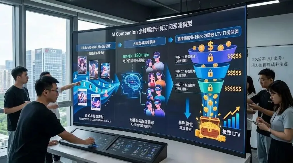 在 2026 年的 AI 出海红海中,“AI 角色陪伴(AI Companion)”赛道向我们残忍却又真实地展示了商业的本质:填补人性的空虚与孤独。用猎奇和幻想的素材在 TikTok 降维获客;用极致共情的大模型和深度记忆死死锁住用户的日均时长;最后,通过“语音通话”、“私密照片”和“极速插队”等特权,设置极其高昂的 IAP 订阅墙。看懂这套将“高维情绪寄托”转化为“极致 LTV(生命周期总价值)”的订阅深渊模型,你就能在竞争极其惨烈的 AI 出海大盘中,用最强的人性羁绊,赚取最重度的暴利美金!