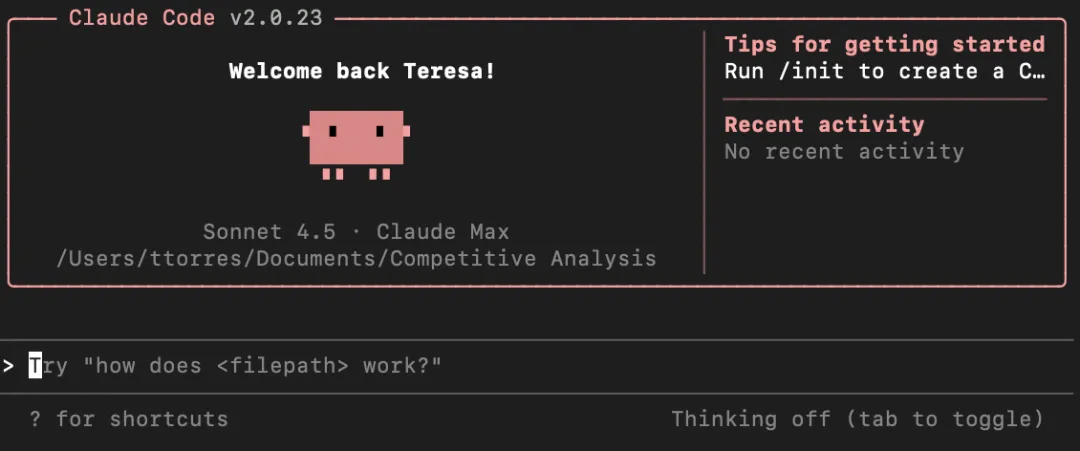 启动后,你会看到 Claude Code 的欢迎界面,包括当前会话信息、最近的对话记录和最新更新说明: