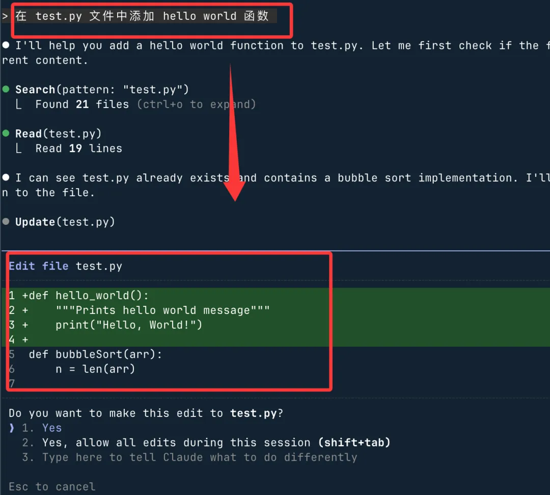 在 test.py 文件中添加 hello world 函数Claude Code 会展示建议的代码修改,并在执行前请求你的确认,选择 yes 后按回车即可应用: