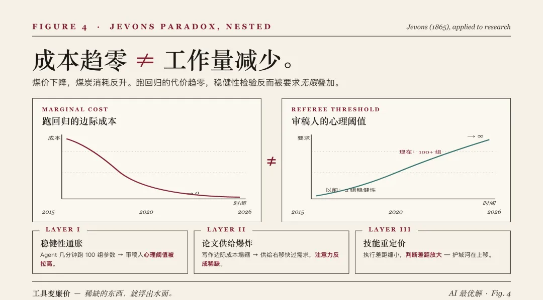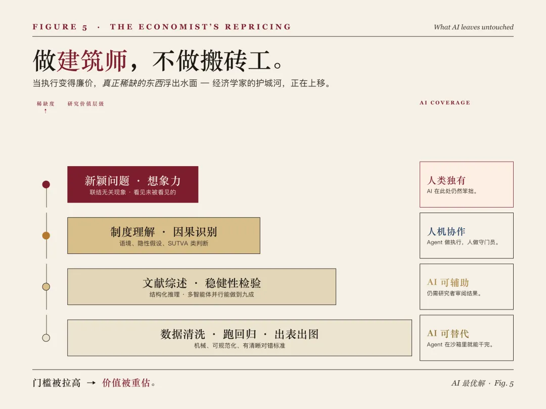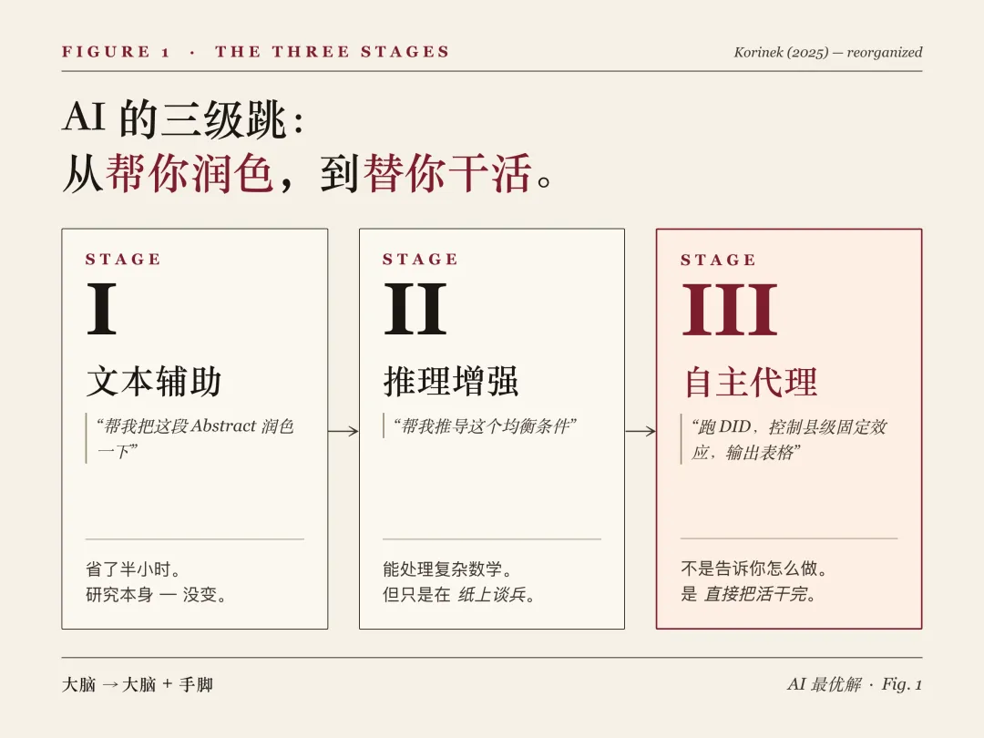 这就是 2026 年的经济研究者必须同时凝视的两种幻觉:一种是"AI 还只是润色工具"的滞后幻觉,一种是"Agent 无所不能"的光环幻觉。Anton Korinek 在《AI Agents for Economic Research》(2025, NBER)中提到:AI 正在从"快思考的文本生成器"进化为"能自主执行的科研代理"。这是现实的一角,但还远远不是全部。