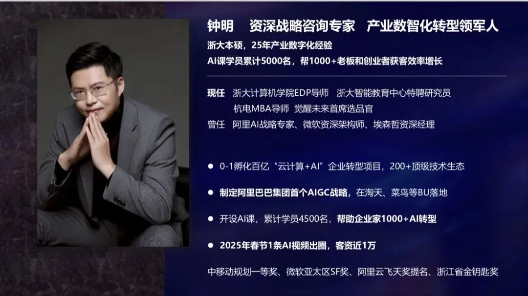这套方法论来自于主讲导师25年深入产业数字化的宝贵经验。导师曾担任阿里AI战略专家、微软资深架构师,2025年一条AI视频即获得近万条客资,累计服务1000余位企业家用AI提升获客效率。