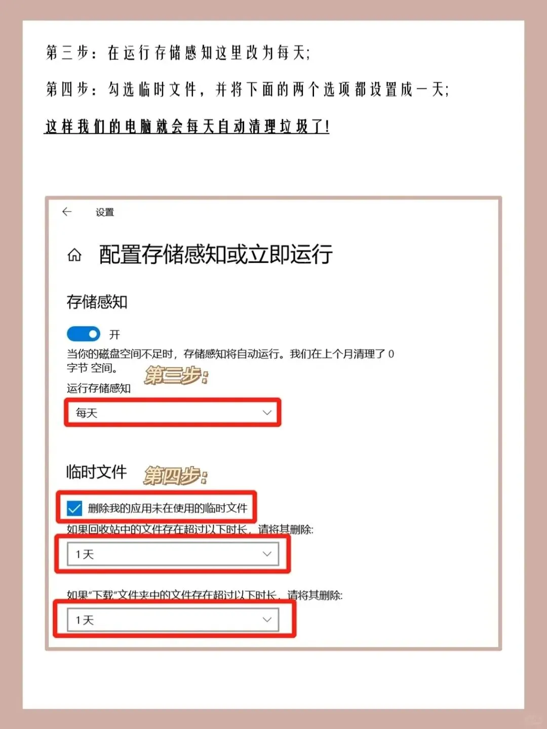 勾选"删除临时文件",回收站和下载文件夹清理时间设为1天