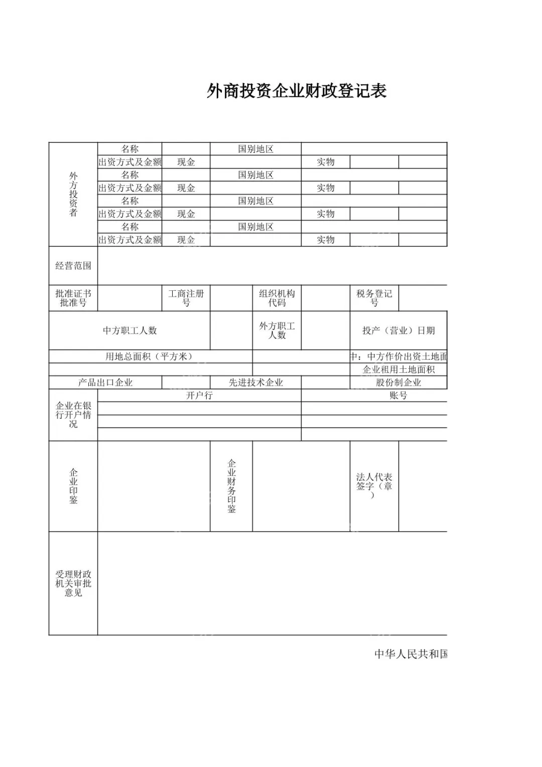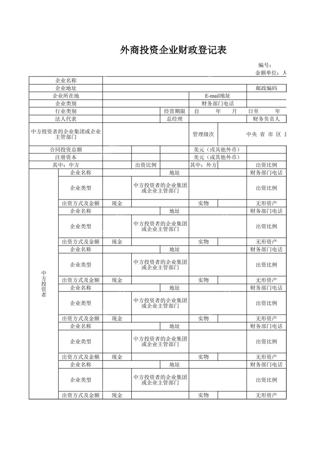 这份由中华人民共和国财政部制定的官方标准外商投资企业财政登记表空白模板,是外资企业完成财政登记合规流程的核心填报依据,完全契合官方文书的规范要求,能为外资企业办事人员、财务从业者提供精准的填报指引。模板整体采用白底黑字的规整表格布局,标题“外商投资企业财政登记表”以黑色加粗字体居中呈现,视觉清晰醒目,符合官方文书的严谨风格。表格内容按照登记逻辑划分为多个专业板块,完整衔接企业填报与官方审批的全流程,无论您是刚完成注册的外资企业,还是需要更新财政登记信息的成熟外资机构,这份模板都能帮助您规范完成填报,助力企业合规运营,顺利通过财政机关的审批流程。