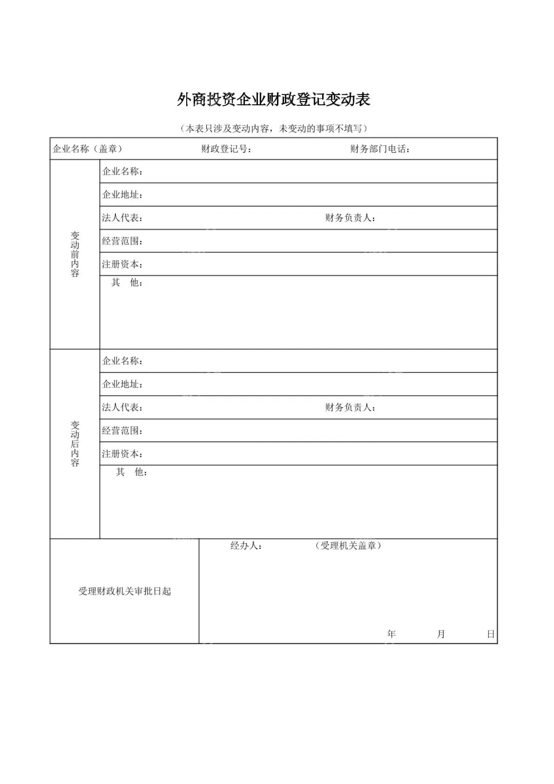 专为外商投资企业打造的实用「外商投资企业财政登记变动表」模板,是外资企业处理登记信息变更的高效工具,能帮财务、行政人员规范完成财政登记变动申请,大幅提升办事效率。模板采用白底黑字的标准表格形式,布局清晰规范,标题下方特意标注填写规则,避免无效操作。表格栏位设置全面且贴合外资企业变更需求,完整覆盖申请-受理-审批的全流程记录需求,帮你规范梳理变更信息,减少因填写不规范导致的返工,让财政登记变动办理更顺畅。