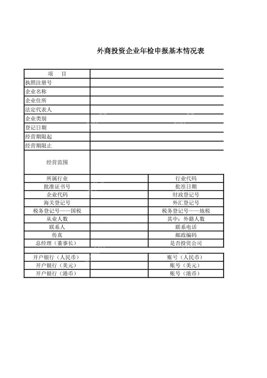 这份白底黑字、布局规整的“外商投资企业年检申报基本情况表”,是外资企业完成年检申报的标准化填报模板,专为企业行政、财务人员高效筹备申报资料打造。表格左侧的“项目”栏全面覆盖了外资企业年检申报所需的各类核心信息,从基础登记信息到经营资质、运营细节一应俱全,右侧对应空白填写区域,为企业精准录入信息预留了充足空间,能帮助企业系统梳理年检申报所需资料,避免遗漏关键信息,大幅提升年检申报的筹备效率与准确性。