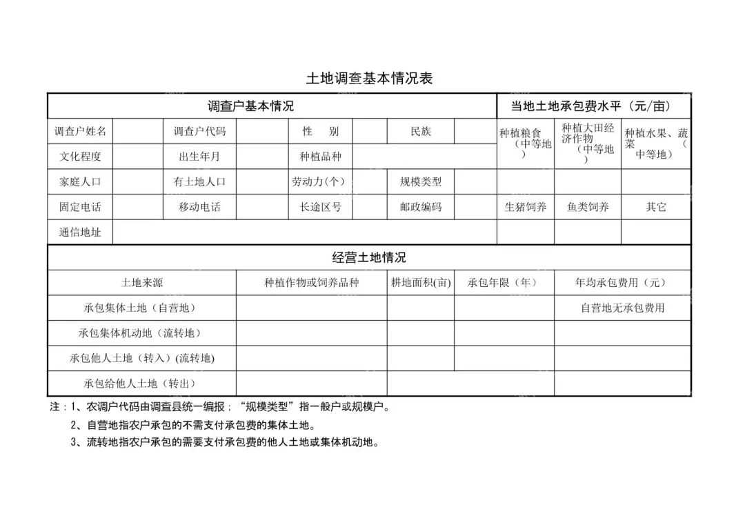 这份土地调查基本情况表是基层土地调查、农业统计工作的标准化数据采集利器,专为规范土地信息采集流程、提升数据准确性与工作效率打造。表格核心划分为三大功能板块,覆盖土地调查全维度信息需求:“调查户基本情况”板块为数据溯源与分析提供精准依据,“当地土地承包费水平”板块为农业经济研究、土地流转政策制定提供数据支撑,“经营土地情况”板块聚焦土地核心生产信息。底部附带的专业注释消除填报过程中的理解偏差,帮助高效完成土地数据采集、整理工作。