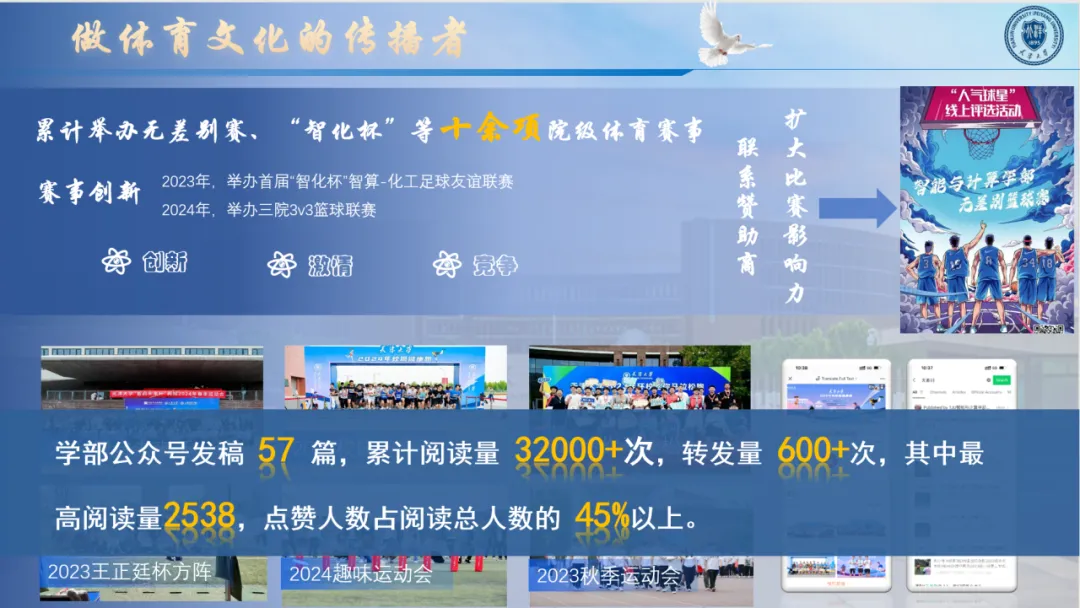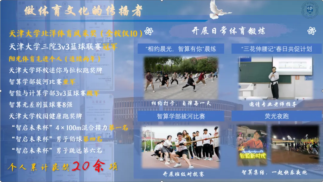 投身体育,燃动校园。他创办特色篮球赛,举办全民“校园健康跑”等百余项体育赛事,实现全方位,多层次覆盖,带动千余名师生投身体育锻炼的热潮。个人参与“王正廷杯”“智启未来杯”等体育竞赛30余项,获奖20余项,荣获“天津大学北洋体育风采奖”,以个人热爱引领运动风尚。