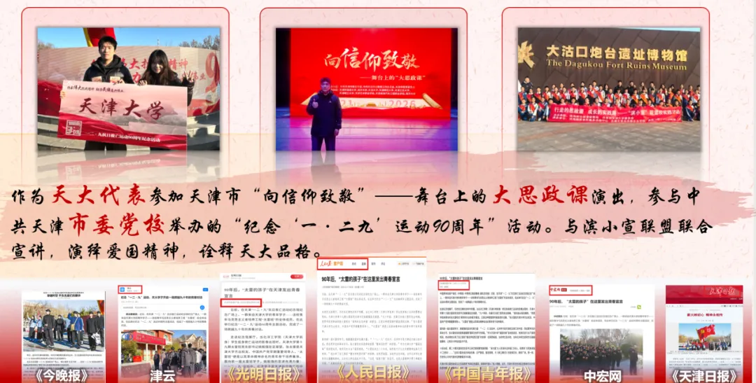 坚定信仰,知行合一。作为太雷班学员,走进社区,以饱满的青春热忱投身助老服务,将温暖送到老人心坎上。他以天津市“向信仰致敬”大思政课演出、“纪念‘一·二九’运动90周年”、“滨小宣”联合宣讲等多种形式,推动红色理论宣讲从课堂走向社会,获人民日报、中青报等主流媒体报道。