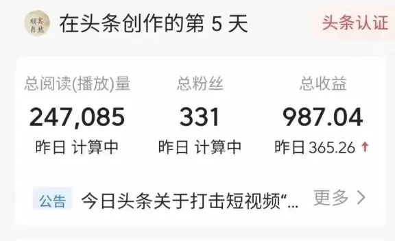 起号快、收益稳平台对垂直内容推荐友好,新号当天发就有流量,坚持更新 3-5 天就能看到稳定收益。