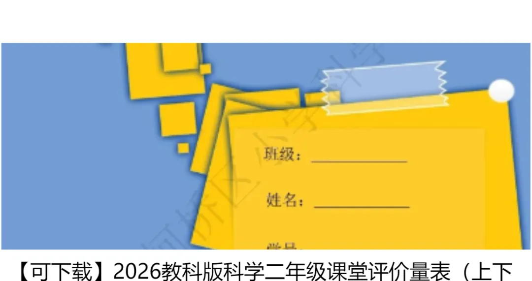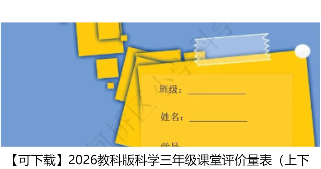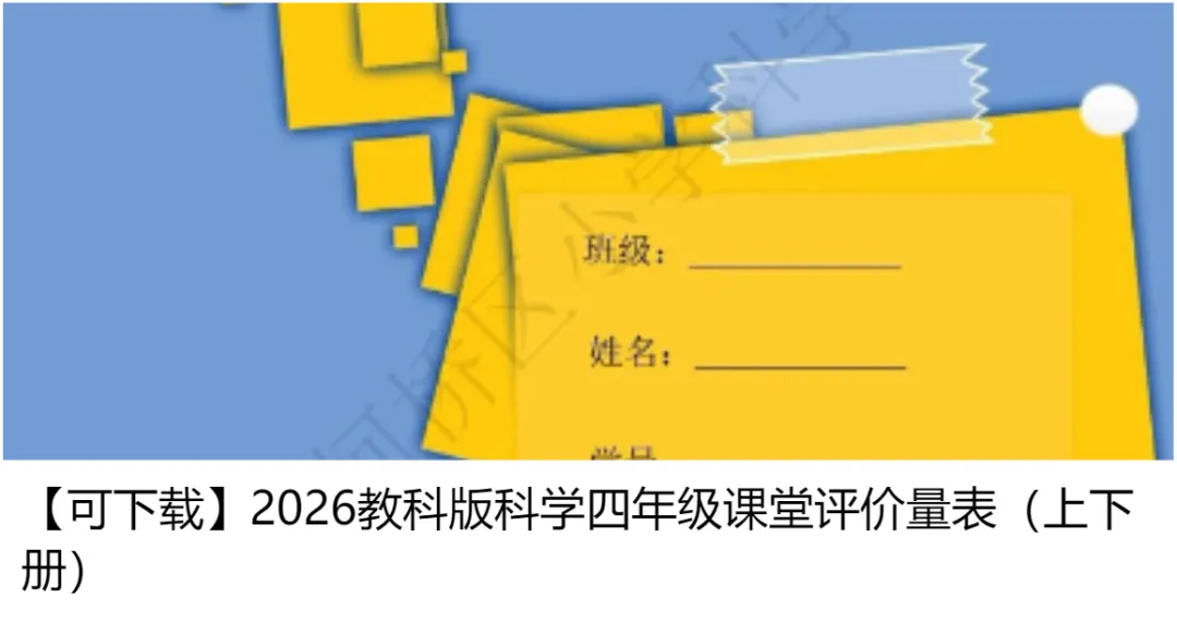 【可下载】全新修订!2026教科版科学1-6年级小学科学课堂表现评价量表 免费下载 完全免费!完全免费!,这套全网最全的小学科学教师资源包(公开课、项目化、命题大赛、大单元、实验说课、AI课堂等)点开上面图片按提示下载 如何在科学课堂中开展表现性评价,达到“以评促学”的效果?绍兴市柯桥区科学团队在金伟平老师的组织下,依据科学课程标准中核心素养的要求,通过理论学习、专家引领、实践探索等方式,设计了适合教科版的小学科学课堂评价量表,根据新教材改版,又对1-3年级进行了重新优化,今天一并打包推送给大家。01领取方式分年级下载请点开相应年级下载内容全套打包12册全套打包长按下面二维码下载本内容来自小学科学教学,本号只做公益分享