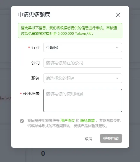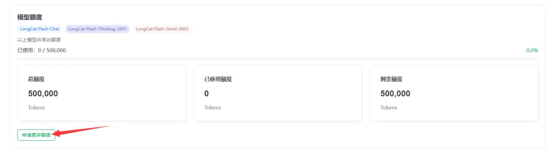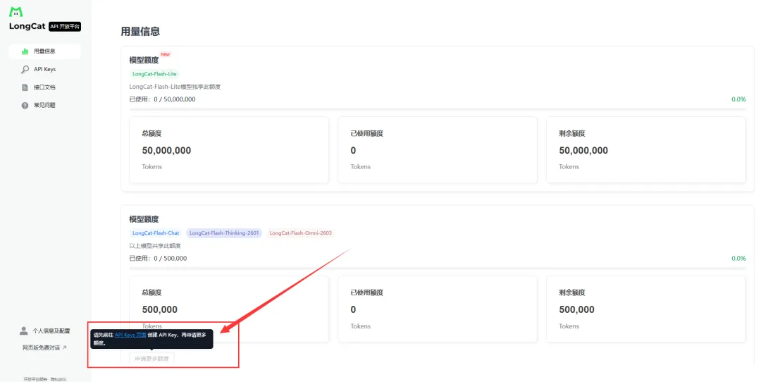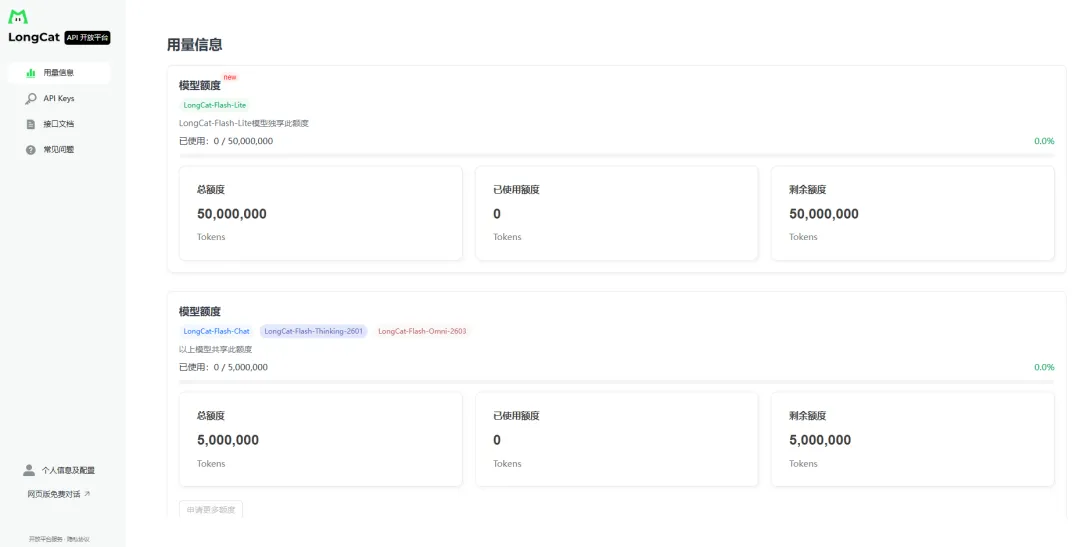 免费额度:每个账号每天自动获得 5,000,000 Tokens 免费额度(默认是 500,000 tokens,如需更多,在线申请即可,待审核后即可获得500,000 Tokens,若还需更多,联系官方申请),可用于LongCat-Flash-Chat、LongCat-Flash-Thinking、LongCat-Flash-Thinking-2601、LongCat-Flash-Omni-2603 和 LongCat-Flash-Chat-2602-Exp;LongCat-Flash-Lite 模型,每个账号每天自动获得 50,000,000 Tokens 免费额度,免费额度将于每日凌晨(北京时间)自动刷新,前一天未使用完的额度将清零,不会累积到下一天。