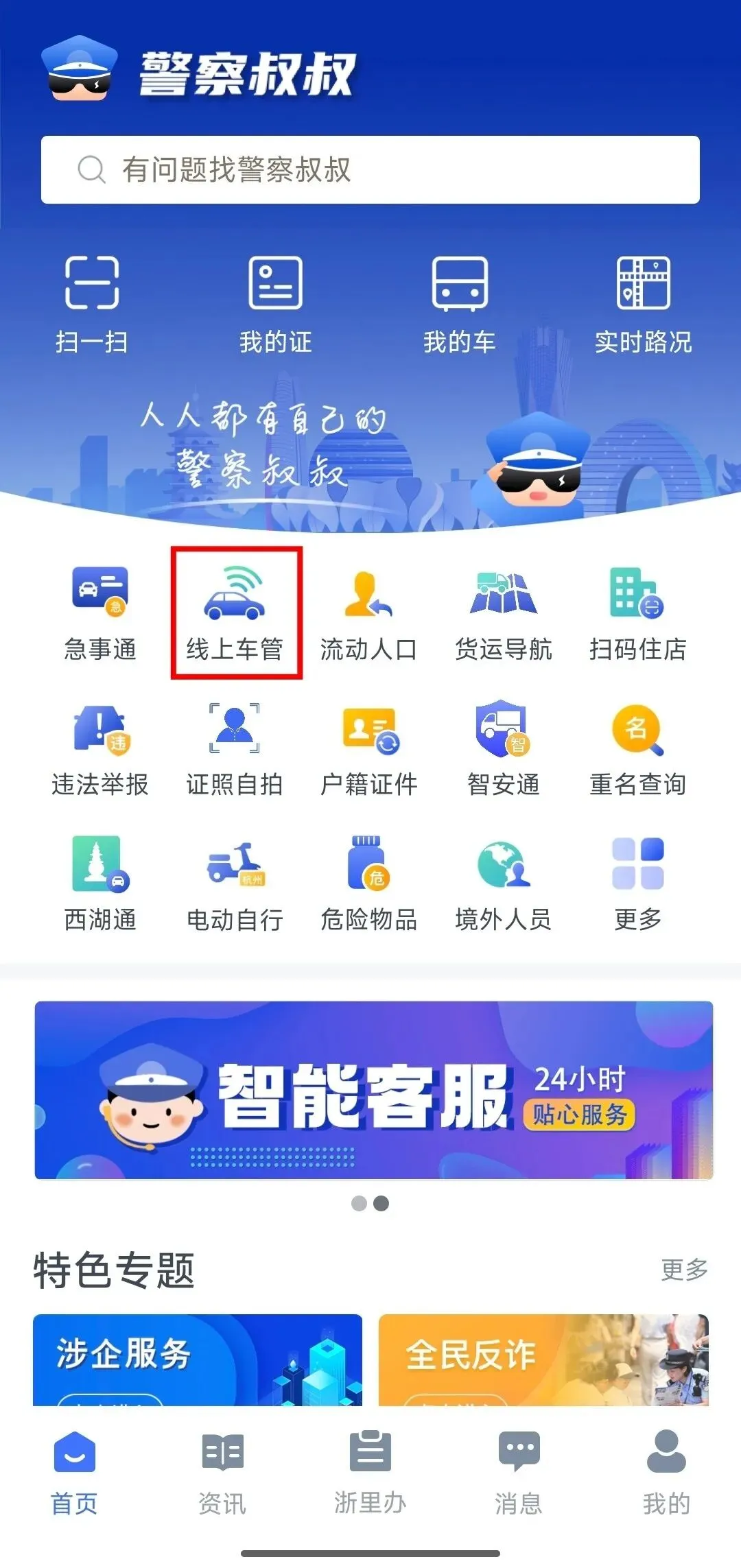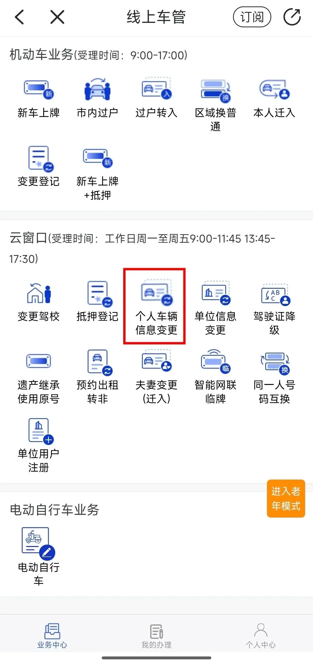 打开“警察叔叔”App → 首页“线上车管”——进入“云窗口”模块 → 选择“个人车辆信息变更”业务。如下图↓↓