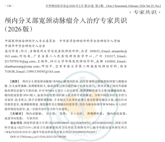 [1] 中国医师协会神经介入专业委员会,中华医学会神经外科学分会神经介入学组,中国卒中学会神经介入分会. 颅内分叉部宽颈动脉瘤介入治疗专家共识(2026版)[J]. 中华神经医学杂志,2026,25(02):126-137. DOI:10.3760/cma.j.cn115354-20251207-00780