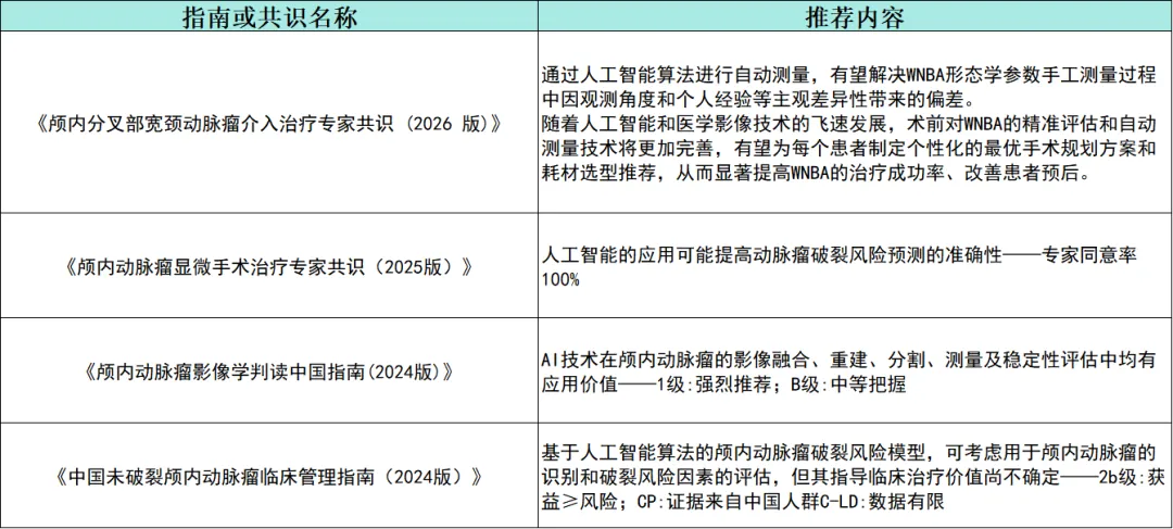 值得关注的是,继《中国未破裂颅内动脉瘤临床管理指南(2024版)》、《颅内动脉瘤影像学判读中国指南(2024版)》、《颅内动脉瘤显微手术治疗专家共识(2025版)》之后,此次《颅内分叉部宽颈动脉瘤介入治疗专家共识 (2026 版)》再一次肯定了人工智能在改善动脉瘤手术方面的积极影响。在论及宽颈动脉瘤测量以及耗材选型时,共识中提到目前临床上存在动脉瘤形态学参数的手工测量结果易因医师主观差异性产生偏差的难题,而人工智能算法的自动测量可消除人为选择带来的差异,另外基于人工智能技术的IFD模拟选型研究结果提示手术模拟和智能选型技术有助于优化相关手术操作及IFD型号选择。同时,该共识也认为:“随着人工智能和医学影像技术的飞速发展,术前对WNBA的精准评估和自动测量技术将更加完善,有望为每个患者制定个性化的最优手术规划方案和耗材选型推荐,从而显著提高WNBA的治疗成功率、改善患者预后。”