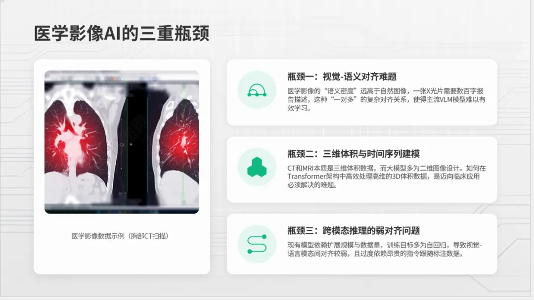 瓶颈二:三维体积与时间序列的建模。CT和MRI数据是三维体积数据,而大模型架构最初为二维图像和文本设计。如何在Transformer架构中高效处理3D体积、如何在有限的计算资源下实现长上下文建模,是影像大模型必须解决的技术难题。