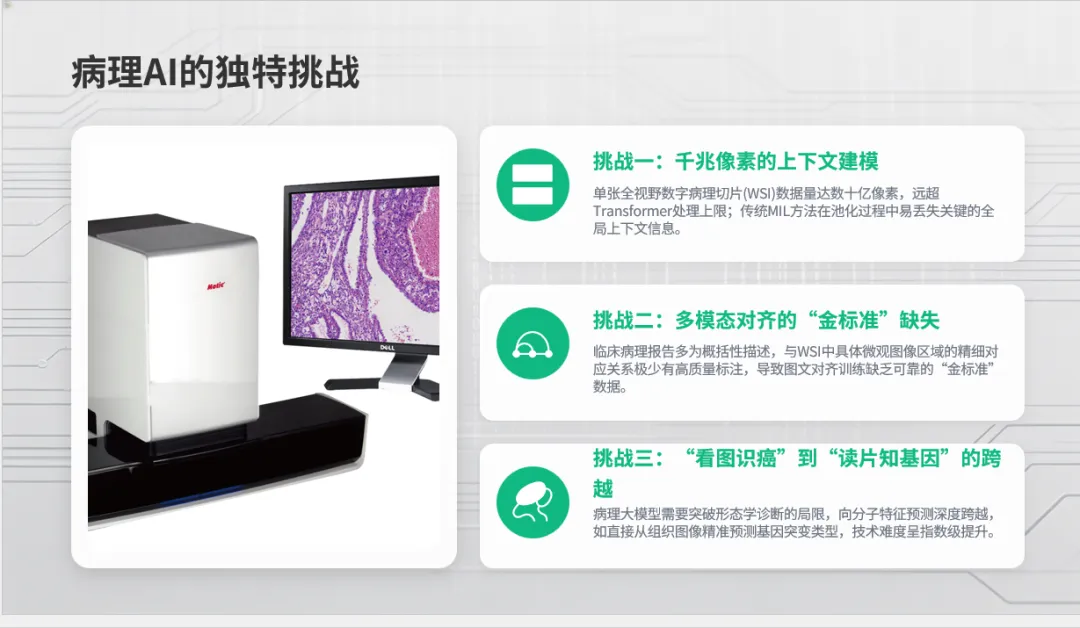 全视野数字病理切片(WSI)的高像素量对现有模型架构提出了前所未有的计算和建模挑战。一张典型的WSI通常包含数十亿像素级别的信息,其数据规模远超任何现有Transformer架构的处理能力。为了应对这一挑战,传统计算病理学领域长期依赖多示例学习(MIL)范式,将WSI分解为小块(patch)进行独立处理。然而,这种方法不可避免地丢失了全局形态学信息和跨区域的上下文关系,从而限制了模型对病变整体特征的捕捉能力[[doc_refer_6]]。近年来,研究人员开始探索端到端全景建模的新方法,例如华银康PanoPath病理大模型的目标是打破传统MIL范式的局限,通过单阶段处理实现全局信息的完整保留。尽管如此,如何在有限的计算资源下高效处理千兆像素级别的数据,仍然是病理AI领域亟待解决的核心问题[[doc_refer_8]]。