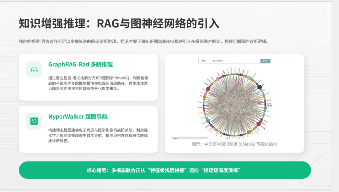 纯粹的视觉-语言对齐不足以支撑复杂的临床诊断推理。前沿方案正在将知识图谱和RAG机制引入多模态融合框架。