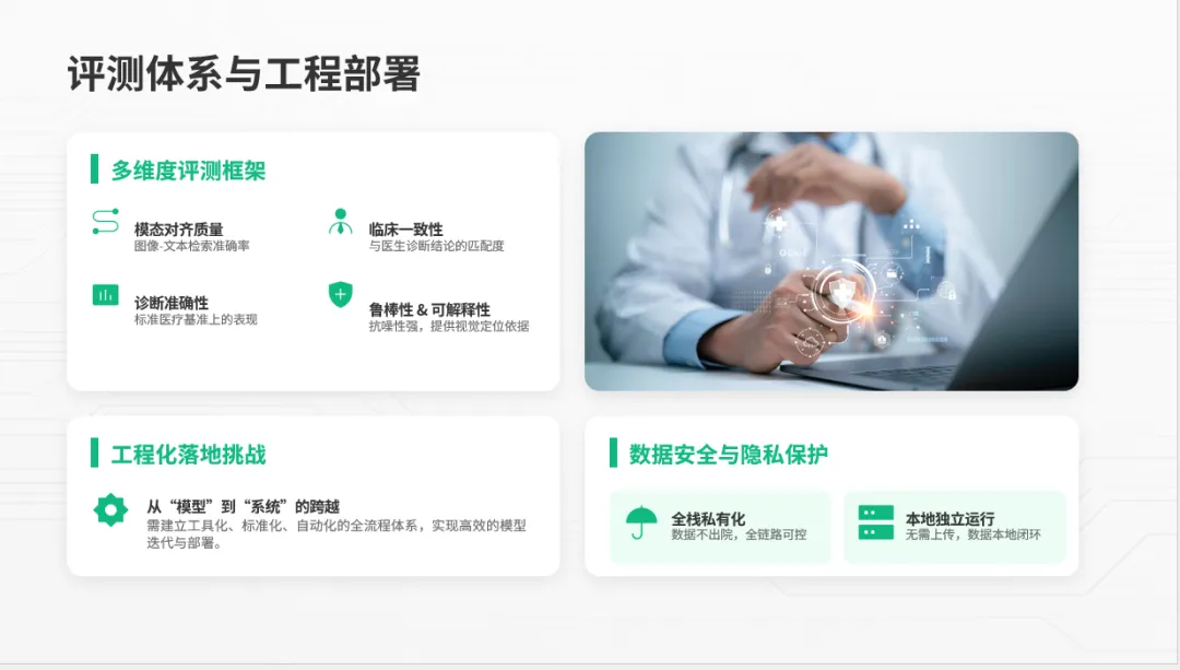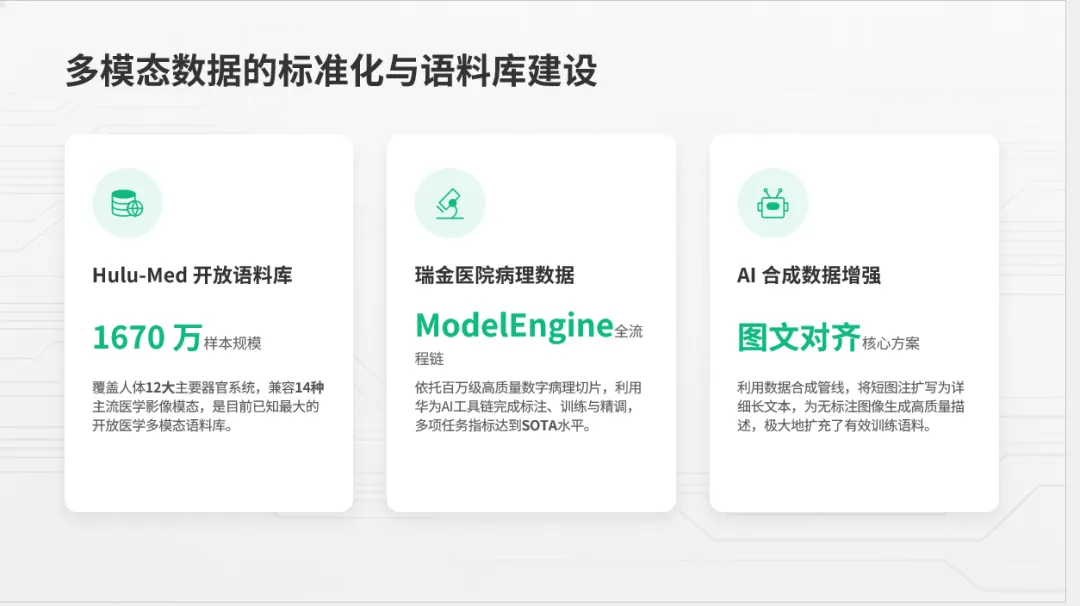 此外,多模态语料库的建设需要兼顾数据的多样性和代表性。Hulu-Med团队通过引入多种疾病类型的数据,确保了语料库在疾病覆盖范围上的广泛性;而瑞金医院则专注于肺癌相关数据的深度挖掘,结合基因组学信息构建了具有高临床价值的专题数据库。这种多层次的数据构建策略,不仅满足了通用场景下的需求,也为特定任务的模型训练提供了支持。值得注意的是,在数据标准化过程中,如何平衡数据隐私保护与数据共享之间的关系仍是一个重要挑战,这需要在技术手段与政策规范两方面寻求解决方案[[doc_refer_3]][[doc_refer_7]]。