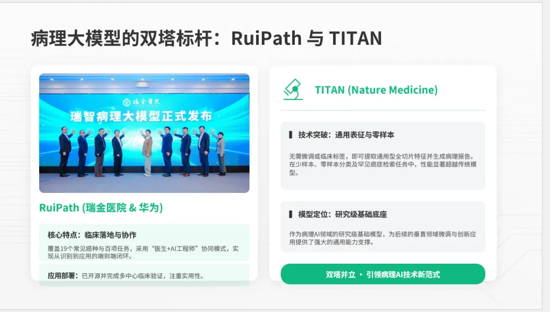 在病理领域,TITAN(Transformer-based pathology Image and Text Alignment Network)采用Transformer架构,使用335,645张全切片图像进行预训练,通过视觉自监督学习和视觉-语言对齐双重机制,构建了通用型的全切片基础模型。